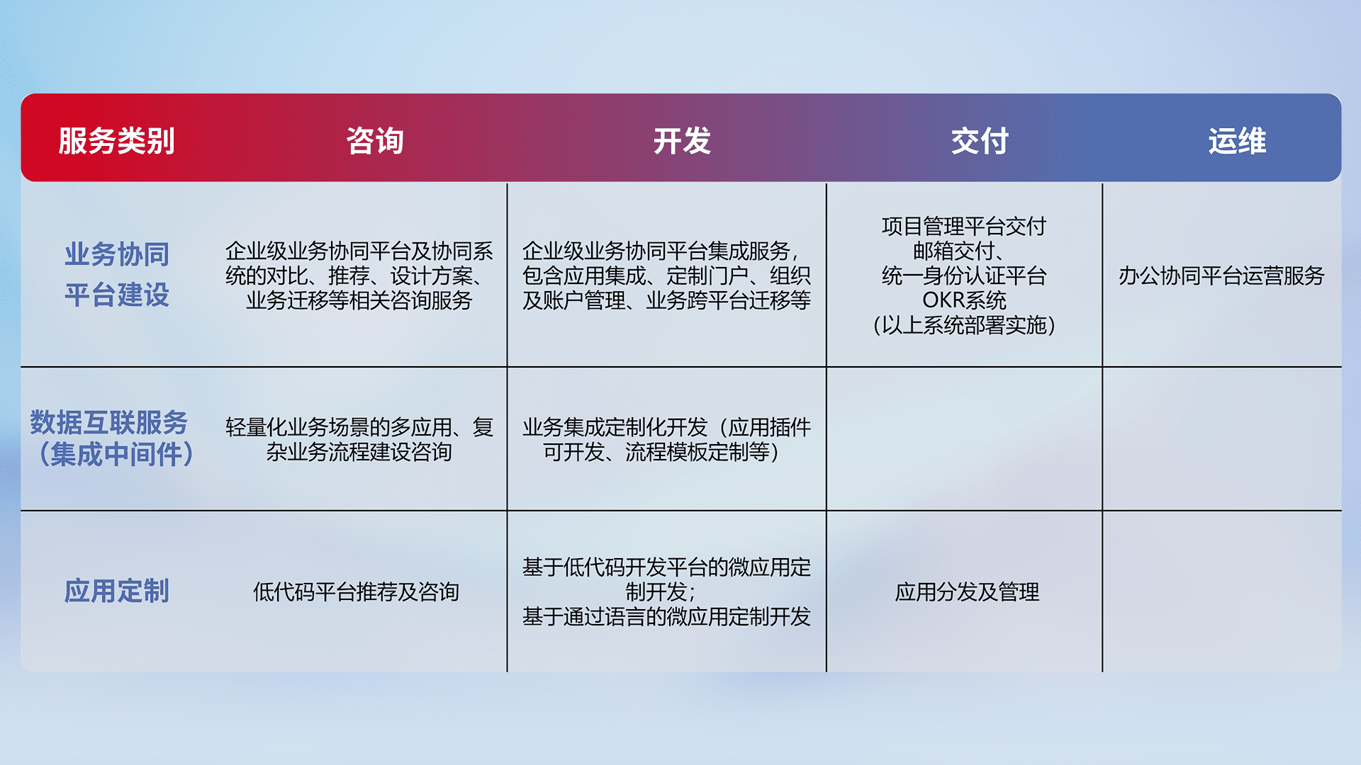 针对钉钉、、、企微、、IDaas等平台级产品提供产品的规划、、、、方案、、、交付、、、、定制化开发等服务,,实现如统一协同办公、、、、智能客户服务、、、混合会议管理、、、智能数据查询、、等业务场景,,,,实现数字化转型。。。